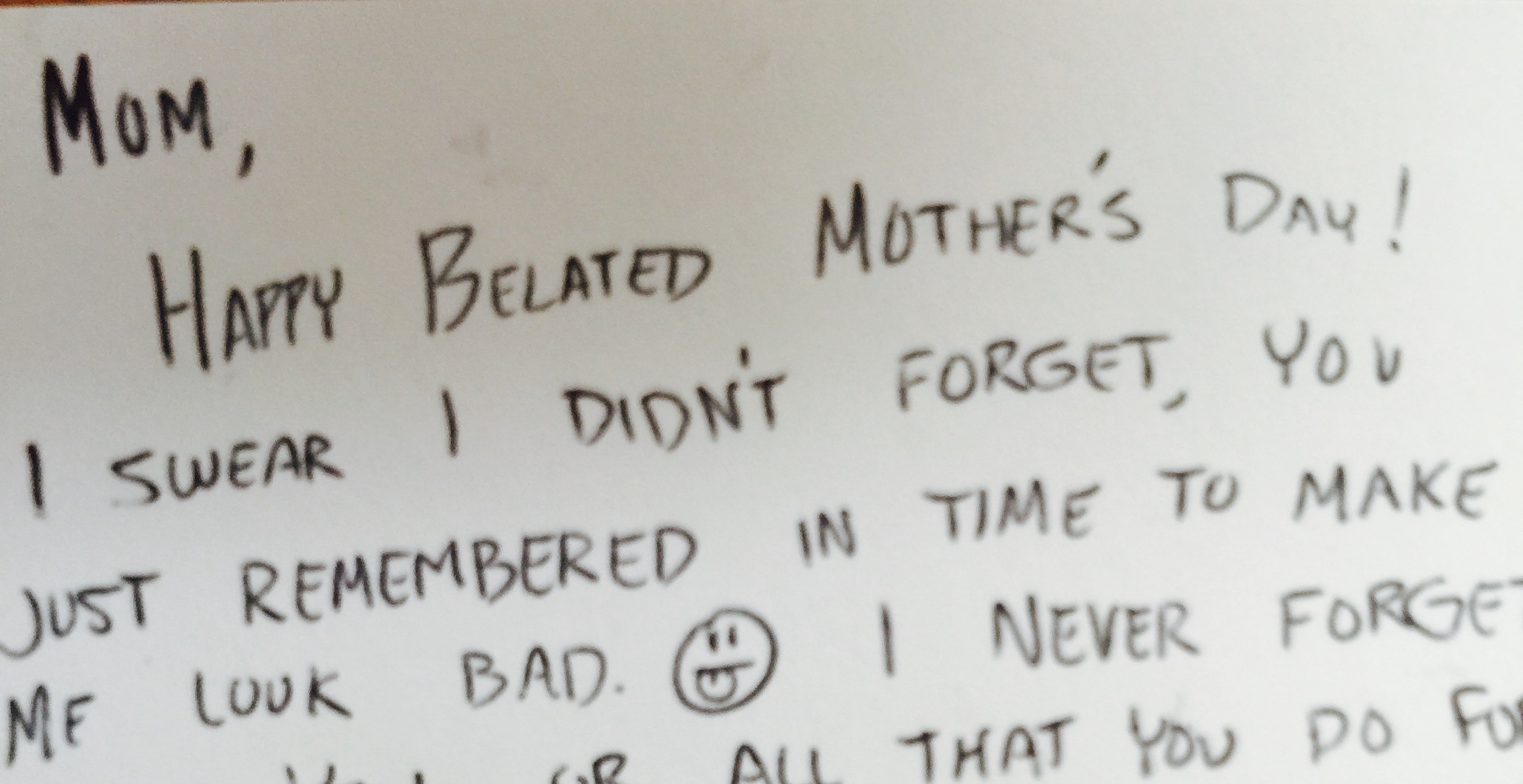 OK. I’m going to spare you the usual mother’s day card shlop. I’m going to tell you what I think you need to hear.…..It ended with…I love you very much and have a Happy Mothers Day.